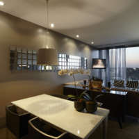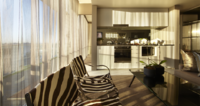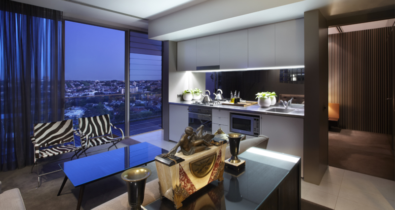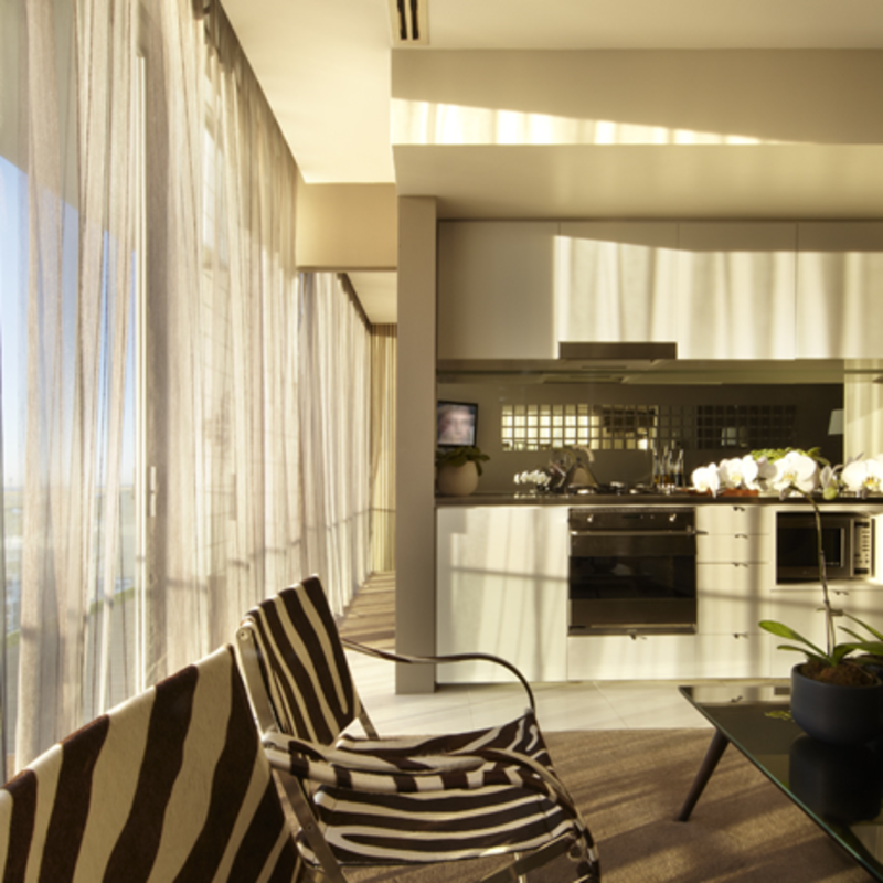 The slick Sky Pad one bedroom apartment is the ideal inner-city retreat for independent travellers. It contains a spacious queen bedroom with en suite – its effortless smart interiors of cubist influence and monochrome palette are at the cusp of swanky living. Swanky, in a good way, of course. The apartment features an open plan kitchen, dining and lounge arena – which are all made more desirable by the picturesque sky high views, stretching over Sydney’s east. The art of light is superbly manipulated throughout the apartment; the pink tones of a sunset are softened through the filter of curtains whilst streamlined ceiling globes create a sensual mood when night falls. Sky Pad is not the apartment for those who believe less is more. From zebra upholstered chairs to striped wall-padding, the apartment is anything but ordinary – but it works and it is fabulous to say the least!